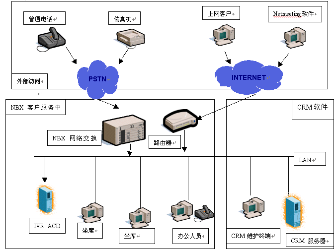NBX客戶(hù)服務(wù)中心為企業(yè)提供與外界的各種溝通渠道,電話(huà)、傳真、電子郵件、Internet語(yǔ)音訪(fǎng)問(wèn)。服務(wù)中心提供自動(dòng)語(yǔ)音應(yīng)答(IVR)、自動(dòng)傳真回復(fù)功能接待大量的客戶(hù)訪(fǎng)問(wèn),在進(jìn)行自動(dòng)回復(fù)的同時(shí),可以對(duì)客戶(hù)訪(fǎng)問(wèn)進(jìn)行分析,記錄客戶(hù)最關(guān)心的企業(yè)產(chǎn)品或客戶(hù)潛在的需求,輸出給CRM軟件,由CRM軟件具體輔助企業(yè)進(jìn)行決策,如銷(xiāo)售重點(diǎn)或新產(chǎn)品方向等工作。