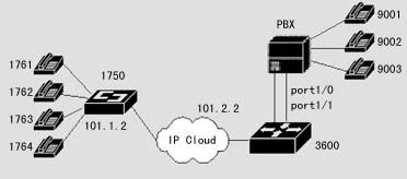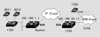 1720也可以通過(guò)器語(yǔ)音端口連接到PSTN,通過(guò)二次撥號(hào),使得兩地的PSTN用戶(hù)可以通過(guò)IP網(wǎng)絡(luò)互相通話,而話費(fèi)只是市話的費(fèi)用。