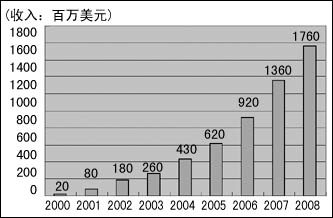 IP PBX亞太市場(chǎng)2000年~2008年預(yù)測(cè)增長(zhǎng)圖
