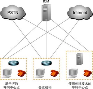 ICM軟件的CTI組件可使用戶實施全面的網(wǎng)絡到桌面CTI戰(zhàn)略,包括座席工作站的綜合功能;贑TI服務器,ICM平臺管理Internet、電信商網(wǎng)絡、ACD、IVR、Web服務器、業(yè)務應用、數(shù)據(jù)庫以及ICM平臺本身提供的實時與歷史信息。此外,CTI服務器可在呼叫進行過程中隨事件的出現(xiàn)為服務器實時提供座席、聯(lián)系與客戶數(shù)據(jù)。