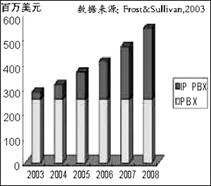 這幾年,IP電話的需求在不斷升溫,尤其在2003年呈快速增長(zhǎng)趨勢(shì)。目前,全球IP電話市場(chǎng)容量每年為10億美元,預(yù)計(jì)到2008年,IP電話的市場(chǎng)份額將超過(guò)傳統(tǒng)的PBX。據(jù)思科公司溫帶策經(jīng)理介紹,思科在前4年,向全球銷售了100萬(wàn)臺(tái)IP電話,而在2003財(cái)年僅僅一年時(shí)間里,就銷售了100萬(wàn)臺(tái)IP電話。