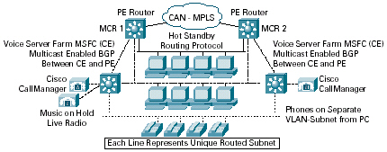 盡管大部分流量都位于VoIP VPN內部,但是仍然有一些流量需要在VPN之間傳輸。這種外聯(lián)網流量目前通過PE在VPN之間傳輸,并且通過訪問列表來限制流量的傳輸方向。一個針對外聯(lián)網連接的防火墻解決方案將提供增強的安全性。BGP被用于為外聯(lián)網連接提供第三層路由冗余。