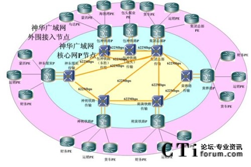 據(jù)神華集團(tuán)信息管理部廣域網(wǎng)項(xiàng)目負(fù)責(zé)人說:“該項(xiàng)目建成后將是一個(gè)建設(shè)在高速傳輸網(wǎng)平臺(tái)之上,并利用其提供的線路構(gòu)成廣域網(wǎng)核心節(jié)點(diǎn)之間的互聯(lián)線路,網(wǎng)絡(luò)拓?fù)湓?個(gè)核心節(jié)點(diǎn)和以北京節(jié)點(diǎn)為中心直連7個(gè)核心節(jié)點(diǎn)的放射型622M環(huán)形+放射混合性企業(yè)頂級骨干廣域數(shù)據(jù)網(wǎng)絡(luò)結(jié)構(gòu)。該網(wǎng)絡(luò)結(jié)構(gòu)可避免任一段光纜中斷造成某節(jié)點(diǎn)直連線路和環(huán)線同時(shí)中斷的可能性,即對網(wǎng)絡(luò)單點(diǎn)故障實(shí)現(xiàn)環(huán)路保護(hù)。同時(shí),網(wǎng)絡(luò)中斷到恢復(fù)的周期大大縮短:傳輸系統(tǒng)中SDH的環(huán)路自愈從中斷到恢復(fù)周期為50ms,網(wǎng)絡(luò)節(jié)點(diǎn)之間通過IGP的路由收斂,從中斷到恢復(fù)的周期約為200ms!