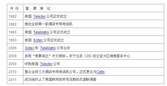 Cetis(美爵信達(dá)) 是全球酒店客房/辦公電話機(jī)的領(lǐng)導(dǎo)企業(yè),全球總部位于美國丹佛,在世界各地設(shè)有生產(chǎn)基地、銷售網(wǎng)絡(luò)及服務(wù)機(jī)構(gòu),并在全球擁有7000多家授權(quán)代理商。2009年12月18日,Cetis(美爵信達(dá))在全球 CEO 孫炳南博士的領(lǐng)導(dǎo)下,正式收購了全球最大的酒店專用電話機(jī)公司—— 美國Teledex(德利達(dá))公司,成為世界上最大、擁有全球酒店客房話機(jī)三大頂級品牌公司的龍頭企業(yè)。