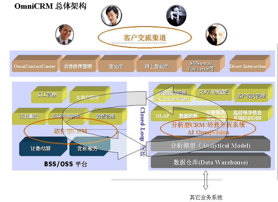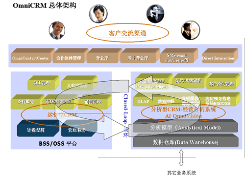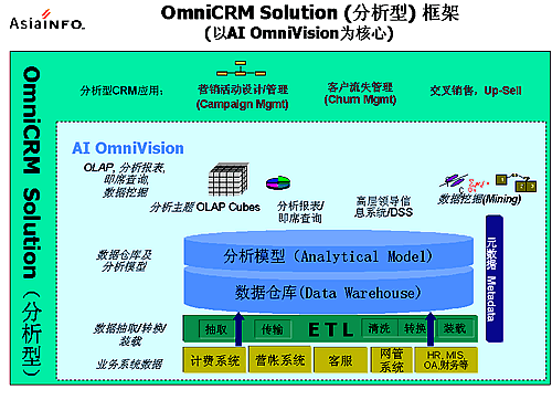 OmniCRM方案是亞信基于多年服務(wù)電信市場的豐富的行業(yè)經(jīng)驗(yàn),以及對國內(nèi)運(yùn)營商業(yè)務(wù)發(fā)展的深刻認(rèn)識而推出的,其中,AI OmniVision是OmniCRM方案中經(jīng)營分析型CRM 的核心產(chǎn)品。AI OmniVision不僅符合行業(yè)業(yè)務(wù)規(guī)范,而且基于對客戶行為、競爭環(huán)境,商業(yè)獲利率以及其他參數(shù)的透徹分析,能夠使運(yùn)營商充分了解現(xiàn)有客戶、識別并關(guān)注贏利的客戶組、提高服務(wù)質(zhì)量、確?蛻魸M意度和忠誠度;同時吸引潛在的客戶;加強(qiáng)提供新服務(wù)的投資回報率;提高效率、減小成本,以實(shí)現(xiàn)業(yè)務(wù)價值的最大化。AI OmniVision采用數(shù)據(jù)倉庫、ETL、OLAP分析、靈活報表展現(xiàn)及數(shù)據(jù)挖掘等技術(shù),包含了用戶分析、業(yè)務(wù)分析、收益分析、大客戶分析、營銷分析、競爭分析、服務(wù)質(zhì)量、新業(yè)務(wù)分析等眾多功能模塊。