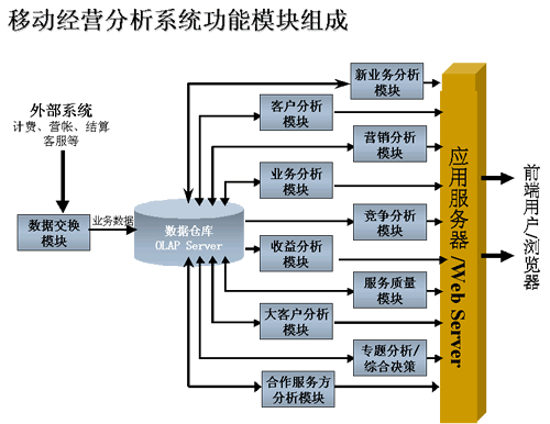 根據(jù)中國移動的業(yè)務(wù)特征,AI OmniVision分為用戶分析、業(yè)務(wù)分析、收益分析、大客戶分析、營銷分析、競爭分析、服務(wù)質(zhì)量分析和綜合決策分析。同時在系統(tǒng)中還需要一些輔助模塊,以保證系統(tǒng)正常順利地運(yùn)行。這些輔助模塊包括: