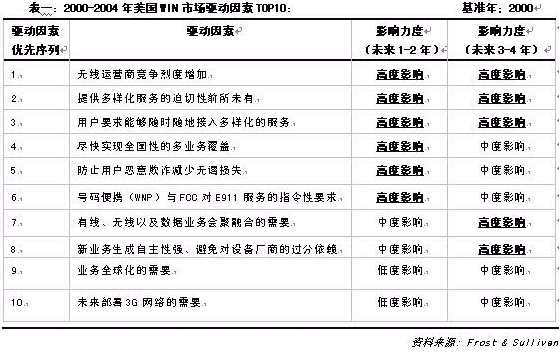 根據(jù)Frost & Sullivan 分析預測,2000-2004年美國WIN設(shè)備市場呈現(xiàn)相對均衡的發(fā)展趨勢,其TOP10的影響因素與影響力度見下表: