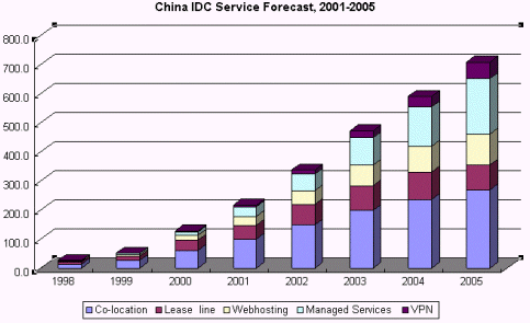 Frost & Sullivan研究表明,在2000年,中國IDC市場規(guī)模約為1億2千萬美圓,預(yù)測到2005年,將達到7億美圓。從2000年到2005年間,中國IDC市場的年平均復合增長率將達42.3% 。