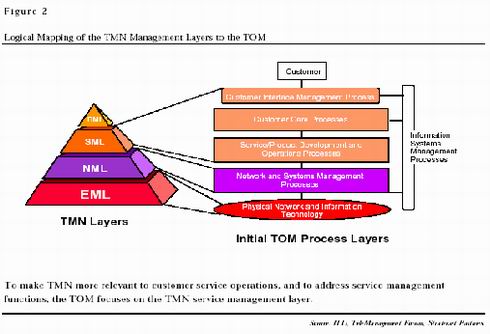 國際電聯(lián)的出發(fā)點(diǎn)雖好,但它更強(qiáng)調(diào)從網(wǎng)絡(luò)元素層開始的清晰的統(tǒng)一體系,而為了保護(hù)自己的商業(yè)秘密,各大運(yùn)營商往往不希望公開自己的網(wǎng)絡(luò)元素層的標(biāo)準(zhǔn),同時(shí),網(wǎng)絡(luò)元素層的標(biāo)準(zhǔn)化對(duì)運(yùn)營商的業(yè)務(wù)發(fā)展幫助不大。在熱烈討論了一段時(shí)間之后,TMN漸漸被忽視了。而另一只希望從技術(shù)角度解決管理問題的力量,電信管理論壇,卻帶有一定偶然性地逐漸確立了自己的地位。電信管理論壇在開始的時(shí)候并沒有夢(mèng)想能建立覆蓋整個(gè)電信運(yùn)營企業(yè)的管理系統(tǒng),其初衷是解決在當(dāng)時(shí)日漸突出的跨企業(yè)的客戶數(shù)據(jù)交換問題。因此,和國際電聯(lián)不同,電信管理論壇從開始就非常強(qiáng)調(diào)實(shí)用性,并把目光集中到了各企業(yè)相互間有大量數(shù)據(jù)交換,因此迫切需要建立標(biāo)準(zhǔn)的服務(wù)管理層和網(wǎng)絡(luò)管理層,并提出了電信運(yùn)營支持系統(tǒng)(OSS)的概念,并公布了模塊化的電信運(yùn)營導(dǎo)圖(TOM)。
