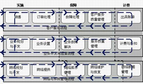 電信運(yùn)營乃至整個(gè)電信企業(yè)的經(jīng)營管理也越來越倚重于電信網(wǎng)絡(luò)支持系統(tǒng)。以最短的時(shí)間向用戶提供最新的業(yè)務(wù),對(duì)同一用戶提供豐富的消費(fèi)方式的選擇,對(duì)不同用戶進(jìn)行交叉銷售,乃至對(duì)價(jià)值鏈中的合作伙伴進(jìn)行有效管理,這些都要求業(yè)務(wù)管理與網(wǎng)絡(luò)體系的高度整合。西方的現(xiàn)代電信服務(wù)企業(yè),都紛紛以操作支持系統(tǒng)(OSS)的要求來規(guī)范自身企業(yè)的運(yùn)營,努力做到企業(yè)的每個(gè)業(yè)務(wù)操作都能在電信運(yùn)營導(dǎo)圖(TOM)中找到相應(yīng)的位置,而每個(gè)步驟和其他步驟的銜接都符合TOM的規(guī)范要求。近年提出的內(nèi)容更加廣泛的擴(kuò)展電信運(yùn)營導(dǎo)圖(eTOM)更是規(guī)范了電信業(yè)務(wù)管理的所有重要方面。