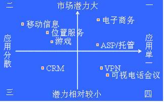 。〉谌笙蓿菏袌(chǎng)潛力比較小,應(yīng)用比較分散。由于經(jīng)營靈活,貼近客戶,小服務(wù)提供商在此會(huì)有非常大的優(yōu)勢(shì)。大型運(yùn)營商如想經(jīng)營此象限內(nèi)的業(yè)務(wù),必須努力減小不同用戶需求的差異,并造成成本領(lǐng)先。如客戶關(guān)系管理(CRM)。