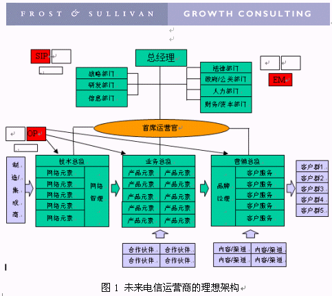 Frost & Sullivan(中國)公司深入研究國際主流運營商的組織結構與管理模式,同時參考了國際上公認的eTOM模型,并結合國內電信運營商組織結構的現狀,提出了圖1所示的未來電信運營商的理想架構。理想架構的確定對電信運營管理的變革具有重要的意義。只有事先明確了方向,并且對未來達成了廣泛一致的共識,才能對目標過程進行分解,有步驟、有方法、有成效的完成目標。