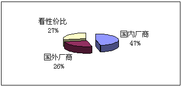 (5)向誰購買:鑒于國內(nèi)并沒有知名度很高的CRM實施廠商,而國外的著名廠商在國內(nèi)的品牌宣傳也不足,所以我們的調(diào)查表中只設了:國內(nèi)廠商、國外廠商和根據(jù)性價比進行選擇三個項目,與購買能力對照,預期實施金額在100萬以下的企業(yè),一般側(cè)重國內(nèi)廠商,而實施金額在100萬以上企業(yè)則側(cè)重國外企業(yè)。