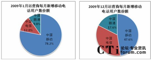 考查三大運(yùn)營商2009年的每月新增用戶數(shù)份額:中國移動(dòng)每月新增用戶數(shù)份額從1月的78.2%下降到12月的47.6%,顯然,中國移動(dòng)每月用戶增速逐漸放緩,而中國電信和中國聯(lián)通的每月新增用戶數(shù)份額呈增長趨勢。
