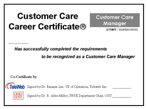 學(xué)員在經(jīng)過(guò)完整的課程培訓(xùn)之后,經(jīng)考試合格,可以獲得由美國(guó)俄亥俄州立大學(xué)與太維資訊有限公司聯(lián)合頒發(fā)的的專業(yè)培訓(xùn)證書(shū)。客戶服務(wù)中心認(rèn)證的目的有兩個(gè):首先,對(duì)于已經(jīng)在客服中心從業(yè)的人員,太維公司的培訓(xùn)可以提供一個(gè)提升他們工作能力的機(jī)會(huì),通過(guò)培訓(xùn)后不同層次的專業(yè)培訓(xùn)認(rèn)證,太維公司以行業(yè)的標(biāo)準(zhǔn)要求對(duì)他們的提升加以證明,以加強(qiáng)他們?cè)谛袠I(yè)中的競(jìng)爭(zhēng)能力。其次,對(duì)于有志致力于在客戶服務(wù)行業(yè)從業(yè)的人事,太維公司廣泛深入、滿足各種需求的專門(mén)技術(shù)培訓(xùn)與相應(yīng)的不同層次的認(rèn)證,為他們進(jìn)入該行業(yè)提供一個(gè)標(biāo)準(zhǔn)的素質(zhì)證明,以使他們能夠順利勝任客戶服務(wù)中心的各種主要的工作職位。