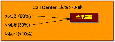 企業(yè)必須牢記在心,成功運營呼叫中心的三要素 人員、流程和技術(shù),三項缺一不可,而更重要的是如何適當?shù)卣线@三項要素。鑒于以往經(jīng)驗,呼叫中心的成功與否,人的因素占60%,流程因素占30%,而技術(shù)因素只占10%。這并不表示可以忽視技術(shù)的重要性,技術(shù)一樣很重要。如果沒有當今日新月異的科技,企業(yè)便無法實現(xiàn)呼叫中心的運營;而成功地實現(xiàn)呼叫中心有效的管理與運營,關(guān)鍵在于管理能力,也就是對人員及流程的把握。