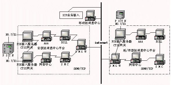 全國(guó)短消息統(tǒng)一平臺(tái)是在省局短消息中心上架構(gòu),各省局下設(shè)地/市局短消息中心。各地短消息中心通過(guò)INTERNET連接,交互信息,ICP業(yè)務(wù)商和其他業(yè)務(wù)平臺(tái)也通過(guò)INTERNET接入短消息系統(tǒng)。根據(jù)《基于電話網(wǎng)的信息終端及綜合平臺(tái)技術(shù)規(guī)范》中的CTSI (Chinese Terminal Service Interface)協(xié)議,短消息系統(tǒng)系統(tǒng)結(jié)構(gòu)可如下圖所示: