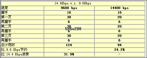 東進傳真卡TC-04FM采用RockWell的33.6K的芯片,提供的傳真速率是 14.4Kbps,相對于 9.6Kbps,可以節(jié)約24.2%的時間(按3頁傳真計算)。各項操作的占用時間比較表如下: