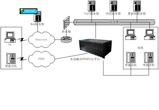to Talk)”發(fā)展到“點擊到交談(Click to Talk)”,通過Internet可以提供IP電話語音呼叫、Call Back、IP傳真、IM、E-mail等功能,擴展了通信渠道,一方面用戶可以實現(xiàn)免費接入到呼叫中心,另一方面企業(yè)能夠向更多的客戶提供優(yōu)質(zhì)、方便的服務(wù)資源,而且由于這些資源的價格相對傳統(tǒng)通信便宜,使企業(yè)為客戶提供全國、乃至于全球服務(wù)成為可能,提高了企業(yè)客戶服務(wù)水平,增強了企業(yè)競爭力。東進互聯(lián)網(wǎng)呼叫中心系統(tǒng)結(jié)構(gòu)如圖所示: