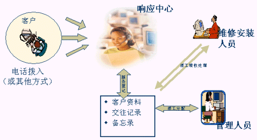談起客戶服務部門的流程管理,我想許多有過這方面經(jīng)驗的人可能會覺得頭大,因為它涉及環(huán)節(jié)多,如派工、配件管理、人員管理、總部對分公司的管理等等。因此,在服務管理系統(tǒng)中,就提供了一種自動化的流程管理,涵概了服務部門的所有業(yè)務應用,包含了客戶響應處理、服務派工管理、配件管理、員工管理以及總部對分公司的管理等,迅速構(gòu)架公司總部與各地分公司溝通渠道,解決總部與分公司信息流轉(zhuǎn)的問題。下圖反應了服務流程管理過程。
