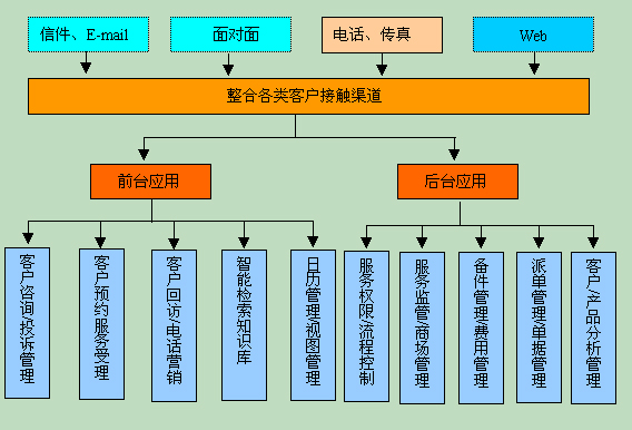 后臺客服應用子系統(tǒng)能夠很方便地與前臺呼叫中心整合,以更全面的功能,提供一流的客戶服務。整個后臺系統(tǒng)包括一系列完善的功能:客戶咨詢/投訴管理、客戶預約服務受理、客戶回訪/電話營銷、智能檢索知識庫、日歷管理/視圖管理、服務權(quán)限/流程控制、服務監(jiān)管/商場管理、備件管理/費用管理、派單管理/單據(jù)管理、客戶/產(chǎn)品分析管理。