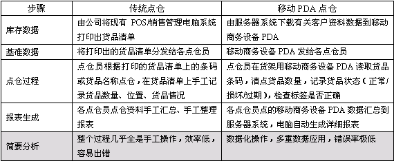 以下對(duì)傳統(tǒng)盤點(diǎn)和移動(dòng)PDA盤點(diǎn)的比較: