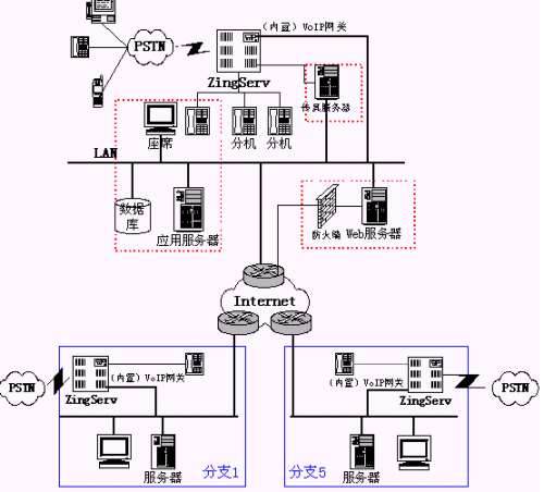目前清華誠志數(shù)碼公司分支機構(gòu)有5個,可以通過ZingServ交換機的內(nèi)置VoIP功能在5個分支機構(gòu)實現(xiàn)組網(wǎng),從而大大節(jié)省長話費用,并實現(xiàn)內(nèi)部分機號統(tǒng)一編碼: