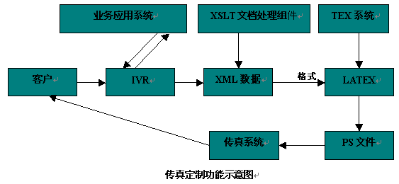 用戶通過IVR與業(yè)務(wù)應(yīng)用系統(tǒng)交互,獲得所需的傳真數(shù)據(jù),這些傳真數(shù)據(jù)在系統(tǒng)中以XML數(shù)據(jù)的格式存在,系統(tǒng)然后調(diào)用XSLT(英文縮寫,XSLT是語言,專門處理XML數(shù)據(jù),通過一段XSLT程序可以將XML數(shù)據(jù)轉(zhuǎn)換成其他的形式的文檔,如HTML,LATEX文檔,從而用來顯示XML數(shù)據(jù)給人們閱讀)文檔處理組件對XML數(shù)據(jù)處理,處理結(jié)果是LATEX(LATEX是TEX系統(tǒng)增加了一些宏指令的增強(qiáng),TEX系統(tǒng)是一個計(jì)算機(jī)排版系統(tǒng),