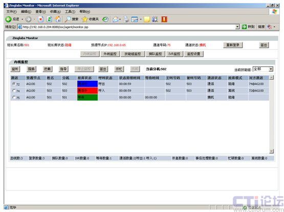 3.模塊界面劃分清晰:Monitor監(jiān)控模塊分為內(nèi)線監(jiān)控、外線監(jiān)控、虛通道監(jiān)控、技能組監(jiān)控和IVR監(jiān)控共五大類。各類別功能獨立運行,可根據(jù)企業(yè)對聯(lián)絡(luò)中心班長的職責(zé)劃分,對各類技能組、項目組的班長登錄提供有區(qū)別的監(jiān)控頁面,從而為每位班長的恪盡職守提供了良好的保證。