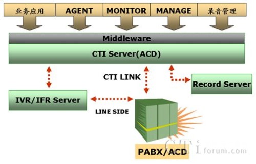 聯(lián)絡中心主要由電話呼叫分配(PBX/ACD)、計算機電話集成(CTI)、交互式語音應答(IVR)、實時錄音和自動外撥等組成,逐漸形成了一個復雜的多系統(tǒng)異構(gòu)平臺。