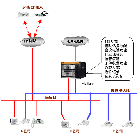 | 多個小型辦公室共享一個電話系統或局域網是一個比較經濟選擇,現在很多辦公樓也是采用這種方式為大樓里的辦公室提供通訊或數據服務,大大減少了租戶的通訊的投資。但是采用傳統的交換機也帶來很多不便。如只能有一個總機,撥入的電話不知道是找哪個公司的,既增加接線員的工作,又不利樹立公司的形象。如何公平地向共用交換機的辦公室的收取電話費也是個解決不了的問題,因為無法記錄和統計每個辦公室的撥出的電話量。 但是采用奧迪堅的ALTISERV,這些問題很自然地就解決了。將每個辦公室設成一個工作組,每個工作組可以設置特定的撥入撥出電話市話號碼,對總機而言,來電時的桌面顯示公司名,或者通過多個自動話務臺直接轉入工作組。 對于撥出電話,只能通過事先設定電話進入市話網。這樣,這個電話的全部費用都由這個公司。 此外,共享的辦公室及其員工都可以使用ALTISERV提供的全部功能,就好象這個辦公室建了一個專門的網絡電話系統一樣。 接線圖如下: |