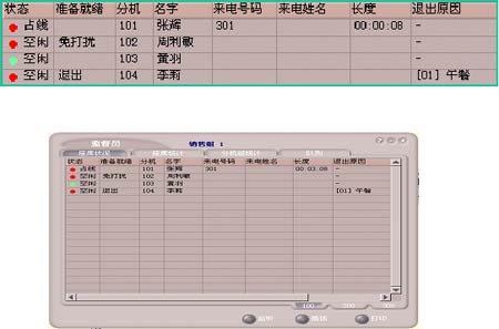 班長(zhǎng)席子系統(tǒng)除了話(huà)務(wù)席子系統(tǒng)中所介紹的全部功能外,還具有監(jiān)聽(tīng)、錄音、強(qiáng)拆電話(huà)、攔截呼叫、話(huà)務(wù)席監(jiān)控、話(huà)務(wù)工作量統(tǒng)計(jì)等座席管理功能。