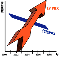 "2005年IP-PBX的使用線數(shù)將超過(guò)傳統(tǒng)PBX。從2001年開(kāi)始傳統(tǒng)PBX以每年12%的速度在下降,IP-PBX以每年30%的速度增長(zhǎng)"。