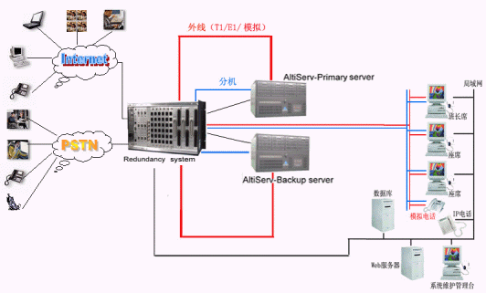 奧迪堅(jiān)通訊系統(tǒng)有限公司作為CTI通訊平臺(tái)的提供商,在技術(shù)上不斷創(chuàng)新,對(duì)產(chǎn)品精益求精,尤其體現(xiàn)在對(duì)系統(tǒng)的運(yùn)行安全性的要求上,為了防止電信接入設(shè)備或者企業(yè)網(wǎng)絡(luò)出現(xiàn)故障而造成的呼叫中心服務(wù)中斷,奧迪堅(jiān)呼叫中心系統(tǒng)提供安全保護(hù)冗余切換系統(tǒng),來保障呼叫中心在意外情況下的正常工作,該安全冗余切換系統(tǒng)通過對(duì)電源、T1/E1、模擬trunk、分機(jī)座席、以及各種網(wǎng)絡(luò)鏈路串口等備份切換來實(shí)現(xiàn)可靠的運(yùn)行。除此之外,奧迪堅(jiān)系統(tǒng)本身也提供強(qiáng)大的安全保障,由于采用先進(jìn)IP內(nèi)核一體化設(shè)計(jì),集傳統(tǒng)PBX、CTI服務(wù)器、IVR、ACD、Recording、FAX等眾多設(shè)備于一體,這樣有效的避免了因?yàn)橥鈷煸O(shè)備過多以及設(shè)備供應(yīng)商的不同而存在的兼容性的問題,從而降低了給呼叫中心系統(tǒng)帶來的的不穩(wěn)定的安全隱患。在系統(tǒng)之外依靠安全保護(hù)冗余切換系統(tǒng),可以實(shí)現(xiàn)外線、分機(jī)、以及各種鏈路接口的雙倍安全運(yùn)行。如上圖所示:兩臺(tái)奧迪堅(jiān)的呼叫中心服務(wù)器和奧迪堅(jiān)安全冗余切換系統(tǒng)構(gòu)成呼叫中心熱備份系統(tǒng),在兩臺(tái)服務(wù)器中安裝所有的呼叫中心功能模塊。通常情況下由主呼叫中心服務(wù)器提供系統(tǒng)的正常運(yùn)行,備份服務(wù)器通過安全保護(hù)冗余切換系統(tǒng)的服務(wù)監(jiān)測(cè)模塊來監(jiān)測(cè)主服務(wù)器的各項(xiàng)設(shè)備和鏈路的使用情況,當(dāng)主服務(wù)器遭遇突發(fā)故障不能繼續(xù)工作時(shí),系統(tǒng)馬上實(shí)施自動(dòng)切換,就會(huì)通過安全保護(hù)冗余切換系統(tǒng)將系統(tǒng)切換到備份的呼叫中心系統(tǒng)上來,此鏈路可以是數(shù)據(jù)、語音、網(wǎng)絡(luò)、串口等。當(dāng)安全保護(hù)冗余切換系統(tǒng)自身出現(xiàn)斷電或者其他故障時(shí),所有鏈路均保持正常工作狀態(tài)。