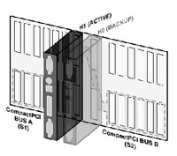 服務(wù)器刀片間的熱備份 背板的各種總線往往會分成兩段,每段有不同的SBC控制。在背板上存在兩個(gè)特殊槽位,在這些槽位上的SBC同時(shí)連接到這兩段總線上,正常狀態(tài)下一個(gè)活動的SBC在控制兩段總線和總線上的設(shè)備,另一個(gè)SBC處在備份狀態(tài),如果活動的SBC出現(xiàn)故障,備份SBC會接管兩段總線和應(yīng)用。參見圖2。
