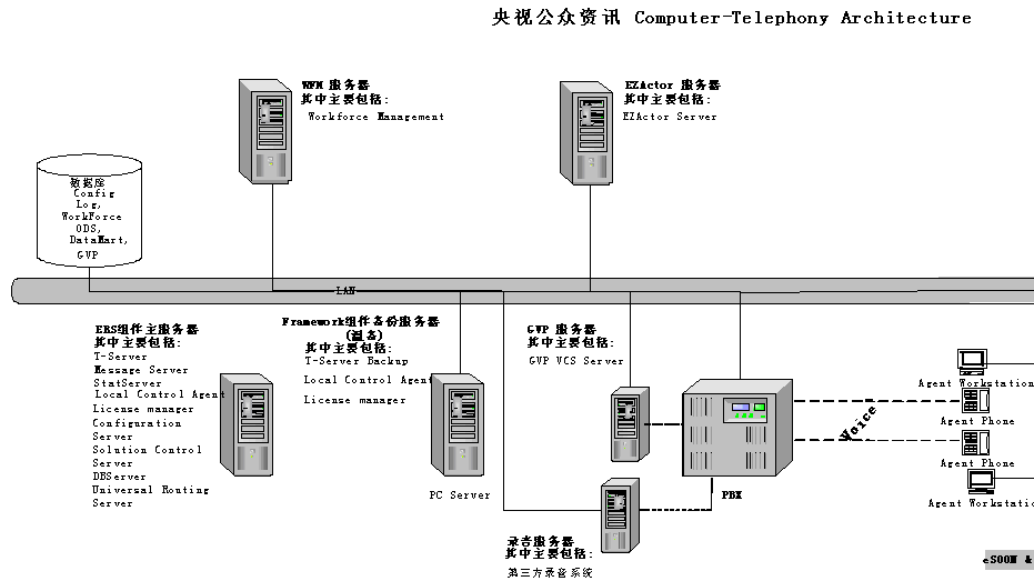 改建后的CCTV公眾資訊中心系統(tǒng),配置了帶冗余備份的Genesys Framework基本平臺及ERS企業(yè)路由解決方案、WFM人力資源管理解決方案、GVP自動語音應(yīng)答解決方案和EZactor呼叫中心CRM平臺。