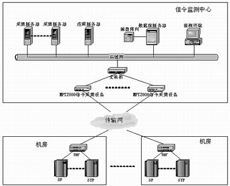 系統(tǒng)采用業(yè)界先進的七號信令監(jiān)測系統(tǒng)的體系結(jié)構(gòu),實現(xiàn)了業(yè)界公認的電信級信令監(jiān)測系統(tǒng)三層結(jié)構(gòu):信令采集設(shè)備、數(shù)據(jù)服務(wù)器/應(yīng)用服務(wù)器和圖形展示終端,具有體系結(jié)構(gòu)簡單、層次清晰的特點。系統(tǒng)的總體結(jié)構(gòu)如圖所示。