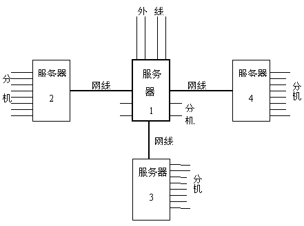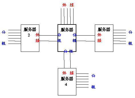 系統(tǒng)中服務器1/2/3/4之間互相通訊依靠電話線。服務器1的分機端口與服務器2/3/4的外線端口相連。所有的外線裝配在主服務器1上。
