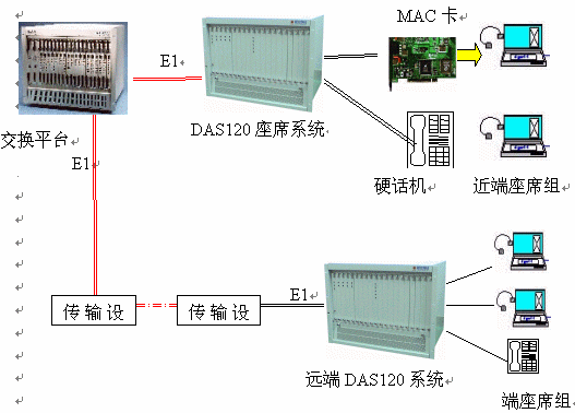 DAS120交換平臺采用1-4個E1連接,可以簡潔實現(xiàn)PCM信號轉模擬信號引出到座席。E1接口的信令可選配為隨路信令CAS和透明通道Clear Channel。E1可通過光端機、微波、HDSL等設備來傳輸,從而實現(xiàn)分布式組網。