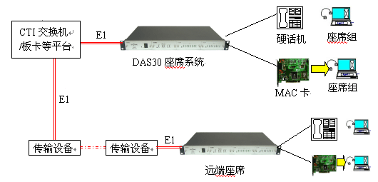 見(jiàn)下圖:DAS30通過(guò)1個(gè)E1接口與交換機(jī)/板卡直接連接,無(wú)需配置數(shù)據(jù),可方便地實(shí)現(xiàn)本地座席接入或遠(yuǎn)端分布式接入(需配合傳輸設(shè)備)。終端可為普通電話(huà)機(jī)或MAC座席電話(huà)卡。