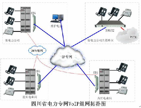 說(shuō)明:南椏河電廠在現(xiàn)有的IP網(wǎng)絡(luò)基礎(chǔ)上,利用IP中繼網(wǎng)關(guān)EEG與SAG32電信級(jí)模擬VoIP網(wǎng)關(guān)實(shí)現(xiàn)交換機(jī)的遠(yuǎn)程放號(hào),實(shí)現(xiàn)了發(fā)電站與電廠、省電力網(wǎng)、電信等的組網(wǎng),解決了實(shí)際的通信問(wèn)題。在方案中,具有組網(wǎng)簡(jiǎn)單,維護(hù)方便,通話質(zhì)量高等特點(diǎn),得到當(dāng)?shù)赜脩舻恼J(rèn)可。