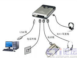 “話務(wù)通”設(shè)計新穎,接口包括電話線路接口、電話機(jī)接口、耳機(jī)接口和USB通信接口。配置立體聲揚(yáng)聲器和環(huán)型提示燈,提供聲光提示。“話務(wù)通”能夠提供IP網(wǎng)絡(luò)電話,自動應(yīng)答,自動外撥,來電彈屏,語音錄放,語音留言等功能。