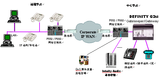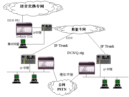 隨著IP網(wǎng)絡(luò)技術(shù)的不斷發(fā)展,數(shù)據(jù)網(wǎng)絡(luò)的融合能力越來(lái)越強(qiáng)。AVAYA在全球范圍內(nèi)率先推出全面符合H.323標(biāo)準(zhǔn)的VoIP解決方案及基于IP中繼的DCS/Q.sig專網(wǎng)透明功能信令。通過(guò)IP中繼將公司全部分支包括機(jī)構(gòu)的DEFINITY交換機(jī)進(jìn)行連接,同樣可以提供全面的專網(wǎng)透明功能和網(wǎng)絡(luò)呼叫中心應(yīng)用,DEFINITY IP中繼可提供豐富的語(yǔ)音壓縮能力,從64Kbps的無(wú)壓縮傳輸?shù)?Kbps的經(jīng)濟(jì)傳輸方案均可提供,同時(shí)通過(guò)復(fù)用在IP包中的DCS/Q.sig信令提供透明功能。