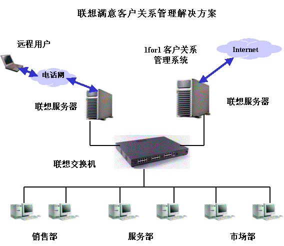 聯(lián)想IT 1for1客戶關(guān)系管理解決方案主要包括以下部分:服務(wù)器端的應(yīng)用軟件采用1for1客戶關(guān)系管理系統(tǒng);服務(wù)器端采用聯(lián)想萬全工作組級和部門級服務(wù)器;客戶端推薦采用中高端商用電腦。
