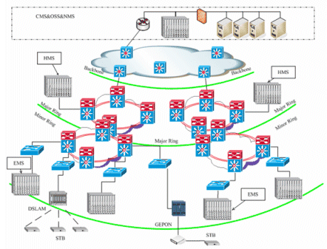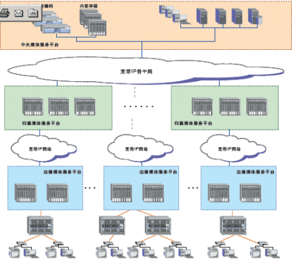 奔流(RollingStream)系統(tǒng)可以支持百萬級(jí)別的用戶規(guī)模,支持3級(jí)和多級(jí)部署架構(gòu)。包括中心節(jié)點(diǎn)(CMS)、區(qū)域匯聚節(jié)點(diǎn)(HMS)以及邊緣服務(wù)節(jié)點(diǎn)(EMS)。奔流(RollingStream)系統(tǒng)對(duì)于寬帶IP網(wǎng)絡(luò)的容忍度是很高的,可以支持各種網(wǎng)絡(luò)承載形式,也可支持各種接入方式。如LAN接入、DSLAM接入、GEPON接入。對(duì)于IPTV系統(tǒng),可建設(shè)專網(wǎng),CMS和HMS、EMS直接相連,也可以旁掛在城域網(wǎng)上。另外,無論P(yáng)PPoE還是DHCP上網(wǎng)方式都可以支持。
