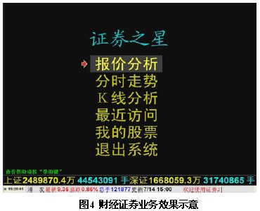 斯達(dá)康奔流系統(tǒng)的“證券之星”業(yè)務(wù)基于電視界面提供用戶一種易接受的信息讀取方式,可以有效地滿足這部分人群的需要。用戶通過(guò)遙控器和電視,可實(shí)現(xiàn)股票大盤行情顯示、個(gè)股實(shí)時(shí)行情分析、各種走線趨勢(shì)圖的瀏覽等功能。