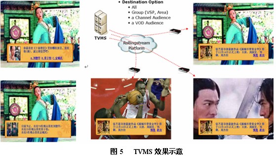 TVMS可以支持用戶間通過(guò)電視屏幕顯示手機(jī)短信息;支持向全頻道發(fā)送信息,如政府公告、天氣預(yù)警、水電費(fèi)用催繳等等;也可以向特定人群發(fā)送廣告信息;廣電運(yùn)營(yíng)商可通過(guò)該功能開展互動(dòng)娛樂(lè)業(yè)務(wù)。