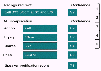 也可使用外部的應用知識內(nèi)容來確定多結(jié)果中的哪一個是有效的。例如,經(jīng)紀業(yè)務應用程序,它的用戶投資隨時間變化而變化。系統(tǒng)可使用簡單的語法來識別股票證券的名稱。識別時,系統(tǒng)產(chǎn)生一個最佳前N個股票名稱的清單,標明假設的股票證券名稱。應用程序然后將每個清單項目(由最佳到最差)和現(xiàn)有股票證券名稱進行比較,從而為該用戶找到可能性最大的一個。下圖展示的是這些多結(jié)果情況,每個結(jié)果都可能有它自身的已被識別的文本、NL解釋和置信度分值。在這一例中,請求了五個識別結(jié)果。