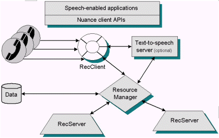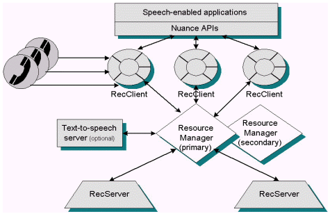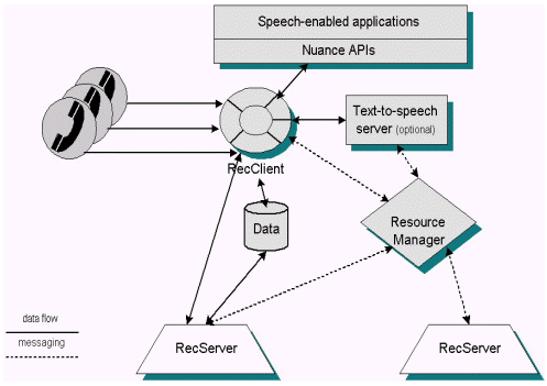 Nuance系統(tǒng)基于開放式客戶/服務機結(jié)構(gòu),特別為大型應用程序所需的健壯性和可伸縮性而設計。呼叫者的講話由客戶端收集,而識別和鑒別處理的負載被平均分配到網(wǎng)絡上的多個分開的服務器上。