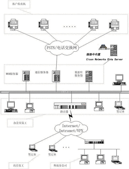 本系統(tǒng)采用最新的J2EE WEB技術,在組成結構上主要由以下三大模塊組成:1)WEB服務器: 完成用戶通過IE瀏覽器接入訪問, 傳真發(fā)送及接收的操作界面,傳真結果的查詢,客戶地址本的維護等工作;2)傳真發(fā)送/接收通信服務器:主要完成驅動傳真板卡,通過通信線路收發(fā)傳真,檢測通信線路、對方狀態(tài),發(fā)送接收隊列管理等工作;3)數(shù)據(jù)庫服務器:主要負責用戶信息,用戶地址本信息,傳真記錄等信息存儲工作。